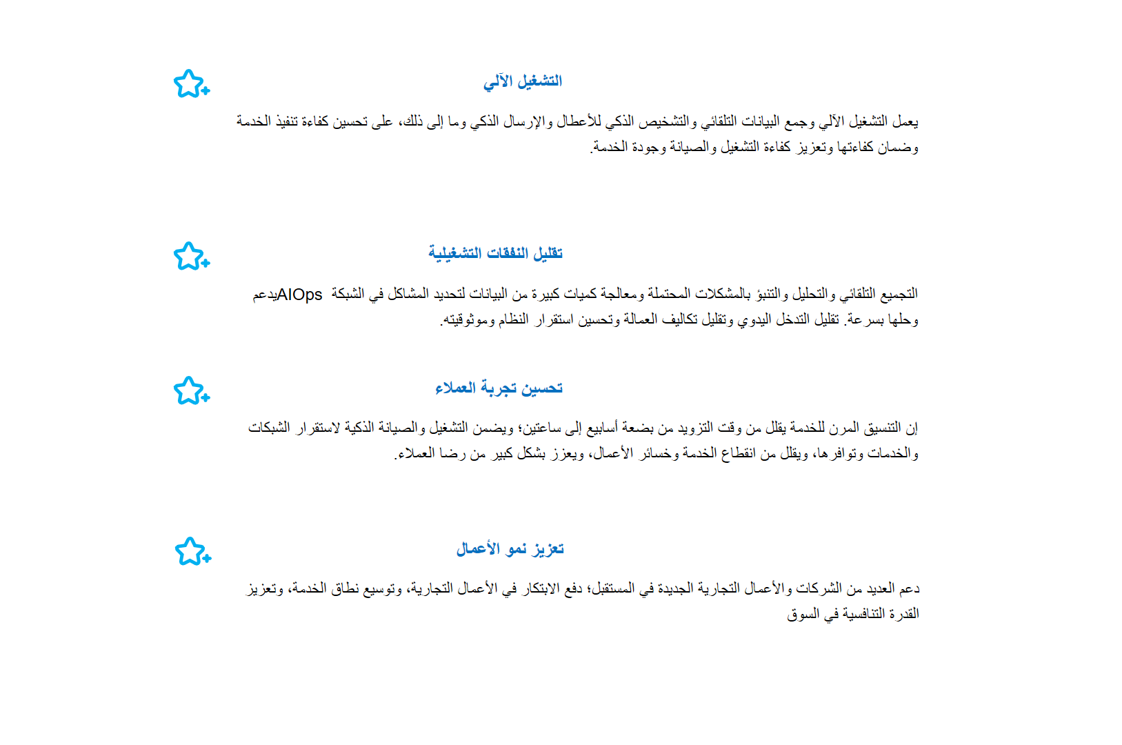إن نظام دعم التشغيل الرقمي القائم على تقنية الذكاء الاصطناعي والتعلم الآلي يساعد العميل على تحسين العمليات التشغيلية وتقليل التدخل اليدوي وتحسين كفاءة التنفيذ والصيانة وتقليل التكاليف. وهي قابلة للتطوير بشكل أكبر للتوسع بسهولة وسلاسة مع نمو الأعمال المستقبلية وتطور الشبكة