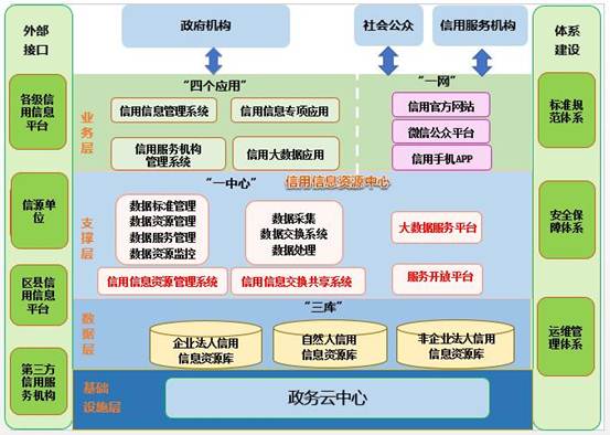 依托电子政务外网,并充分利用现代信息技术和相关业务系统和信息资源,建立“一网、三库、一中心、四应用”公共信用信息平台(即官方信用门户网站、三个公共信用信息数据库、一个信用信息资源中心、四个应用系统)。实现信用信息公示、信用关注及信用核查、联合奖惩、信用风险预警、双公示、信用评估及在各行业、领域的应用;实现征信、管信、用信全过程管理;健全信用监管体制、信用服务市场体系;使政务诚信、商务诚信、社会诚信和司法公信建设取得明显进展,市场和社会满意度大幅提高。