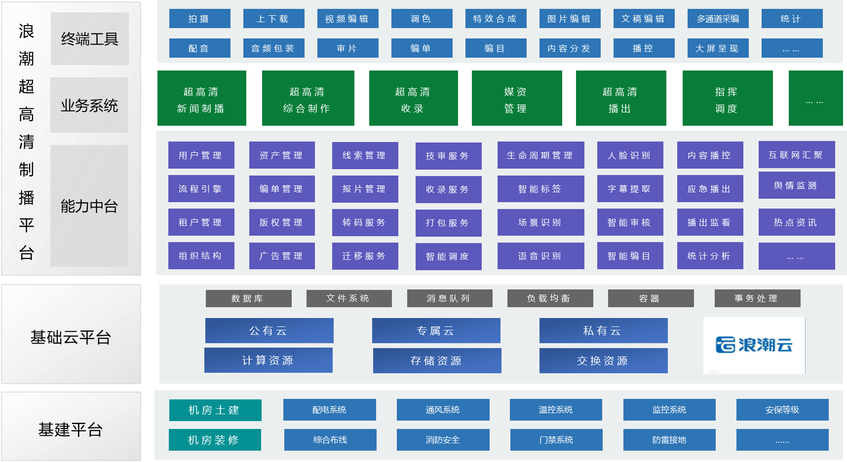 3. 超高清制播方案采用IP化+云平台+AI智能服务的架构,在统一能力中台之上,根据客户实际业务需求可以定制业务系统;